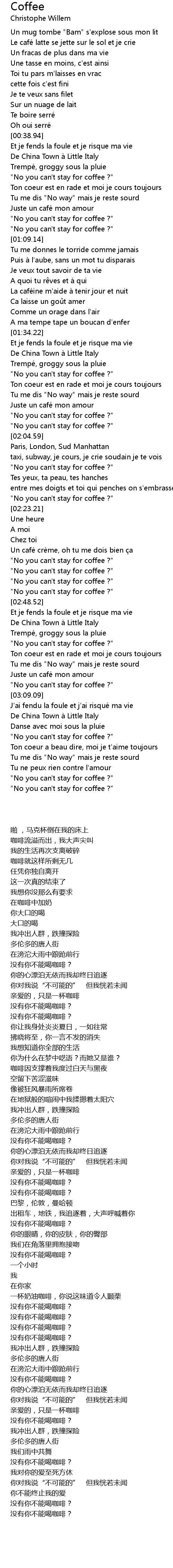 | [00:18.75] | Le cafe latte se jette sur le sol et je crie |