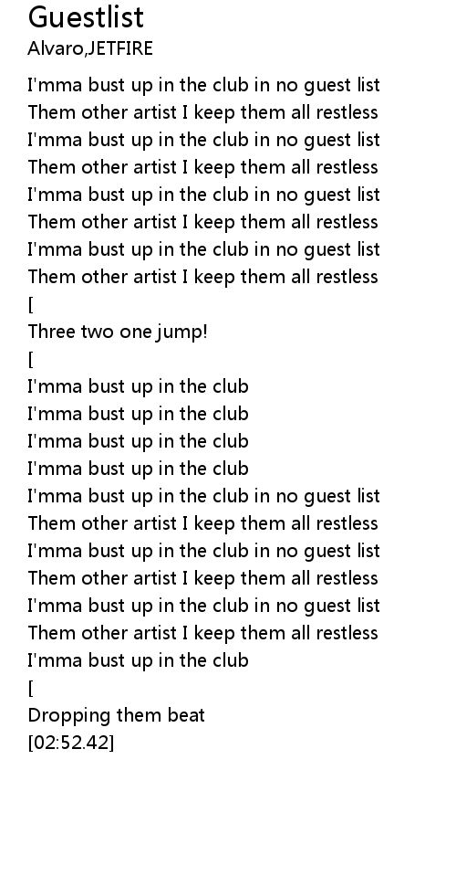 | [00:19.94] | I'mma bust up in the club in no guest list |