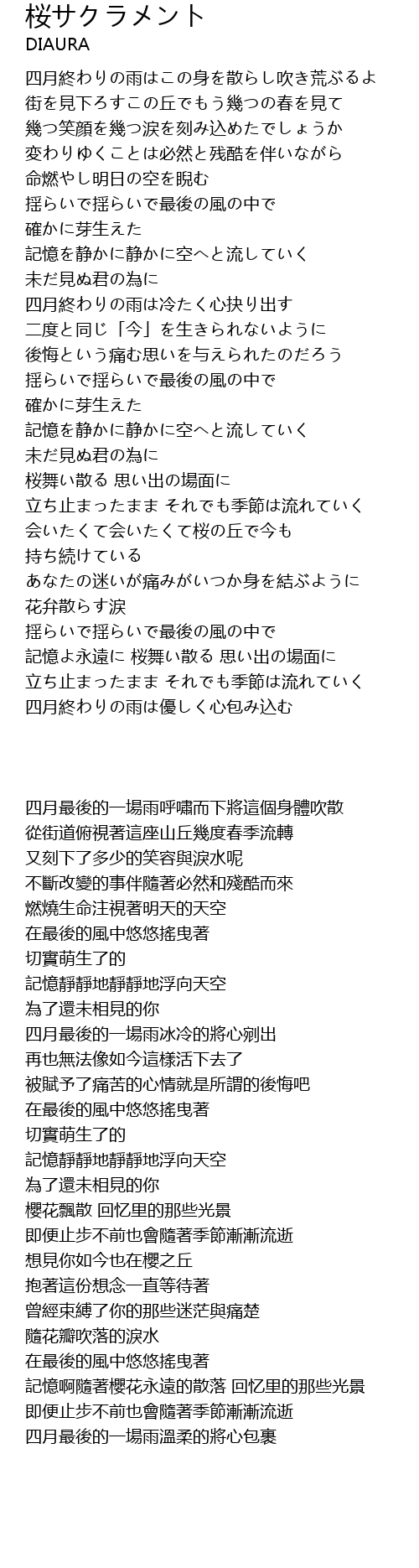 | [04:38:320] | 四月終わりの雨は優しく心包み込む |