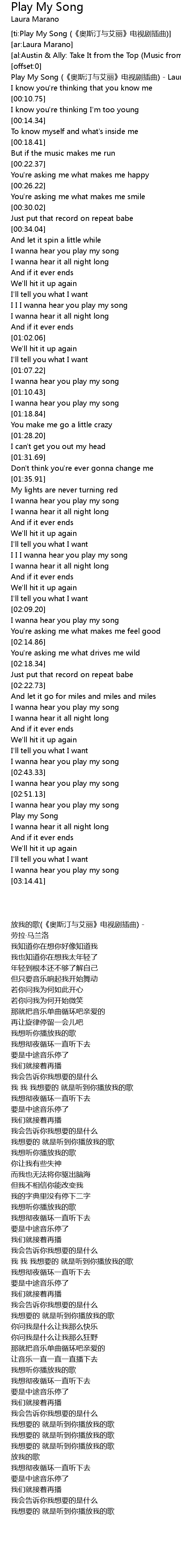 | [00:00.28] | Play My Song (《奥斯汀与艾丽》电视剧插曲) - Laura Marano |