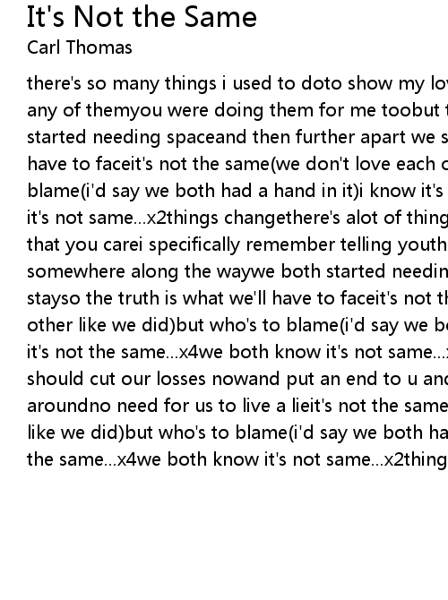 there's so many things i used to doto show my love for youi didn't mind doing any of themyou were doing them for me toobut then somewhere along the waywe both started needing spaceand then further apart we stayso the truth is what we'll have to faceit's not the same(we don't love each other like we did)but who's to blame(i'd say we both had a hand in it)i know it's not the same...x4we both know it's not same...x2things changethere's alot of things you used to sayto show me that you carei specifically remember telling youthat i'd always be therebut then somewhere along the waywe both started needing spaceand then further apart we stayso the truth is what we'll have to faceit's not the same(we don't love each other like we did)but who's to blame(i'd say we both had a hand in it)i know it's not the same...x4we both know it's not same...x2things changemaybe we should cut our losses nowand put an end to u and iif we can't turn this thing aroundno need for us to live a lieit's not the same(we don't love each other like we did)but who's to blame(i'd say we both had a hand in it)i know it's not the same...x4we both know it's not same...x2things change |