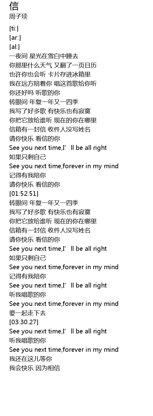 | [02:30.57] | 请你快乐 看信的你 |