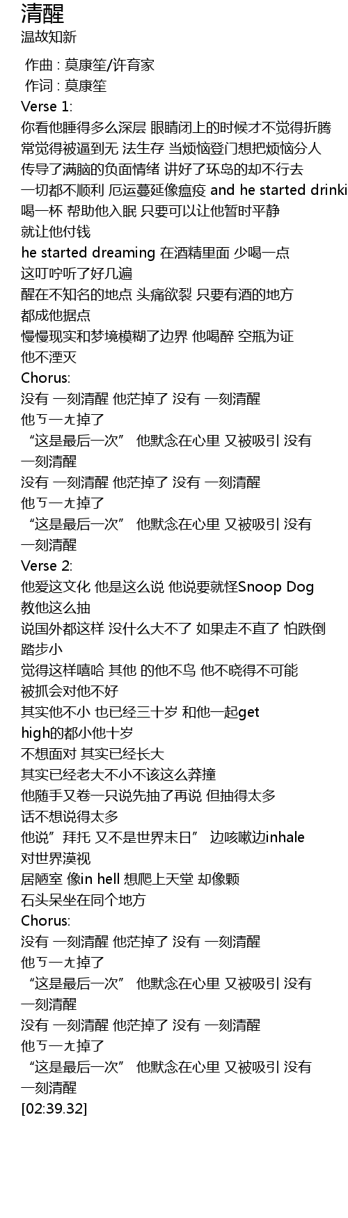 | [02:22.04] | 没有 一刻清醒 他茫掉了 没有 一刻清醒 他ㄎ一ㄤ掉了 |