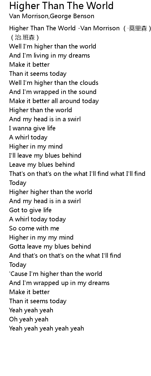 | [00:00.00] | Higher Than The World Van Morrison mò lǐ sēn George Benson zhì. bān sēn |