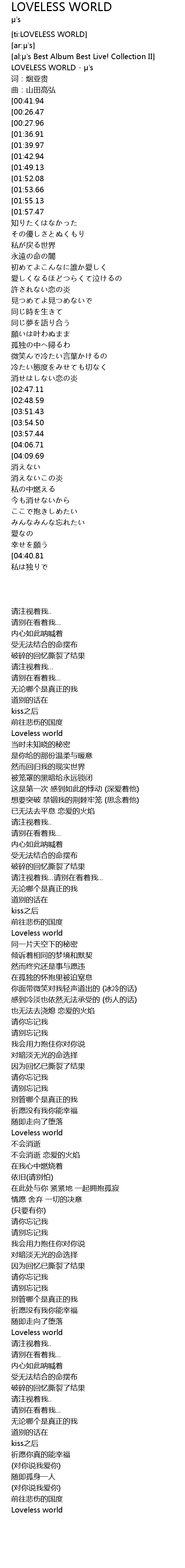 | [00:37.92][01:57.47][02:58.67][04:12.13][04:44.09] | Loveless world |