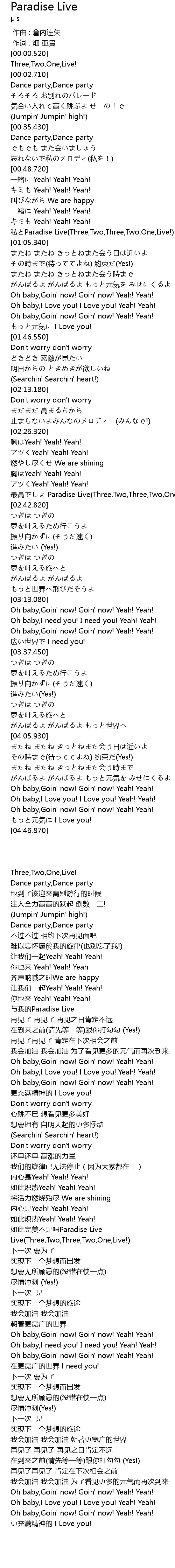 | [00:59.150] | 私とParadise Live(Three,Two,Three,Two,One,Live!) |