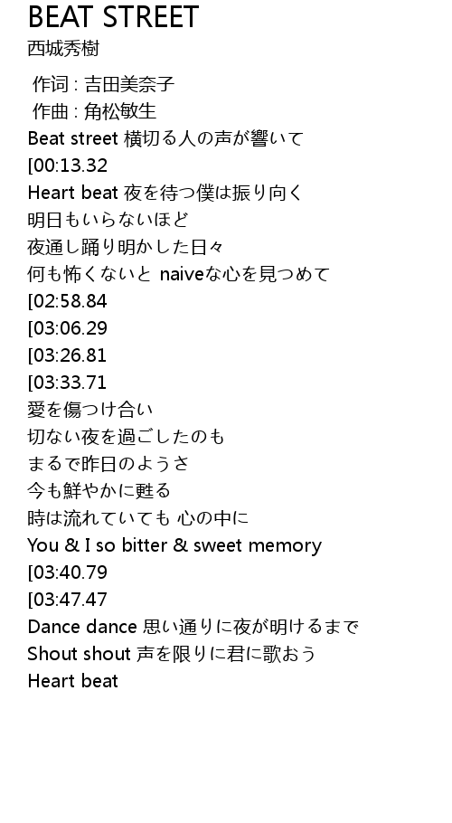 | [00:00.80] | Beat street 横切る人の声が響いて |