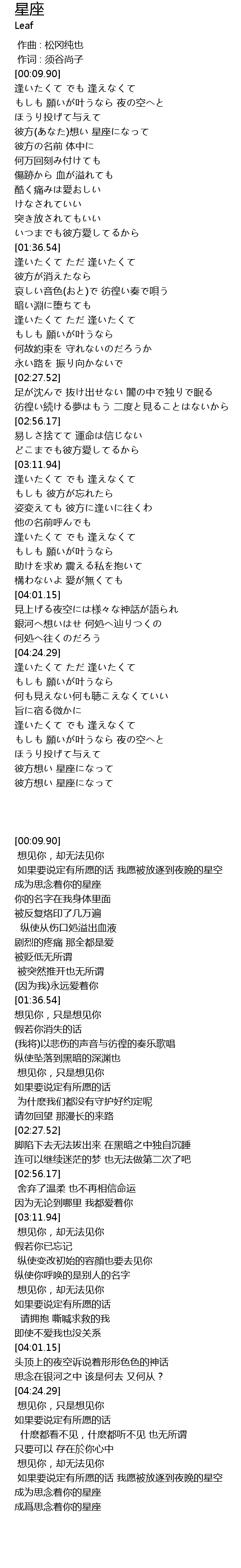 | [00:29.28] | 彼方(あなた)想い 星座になって |