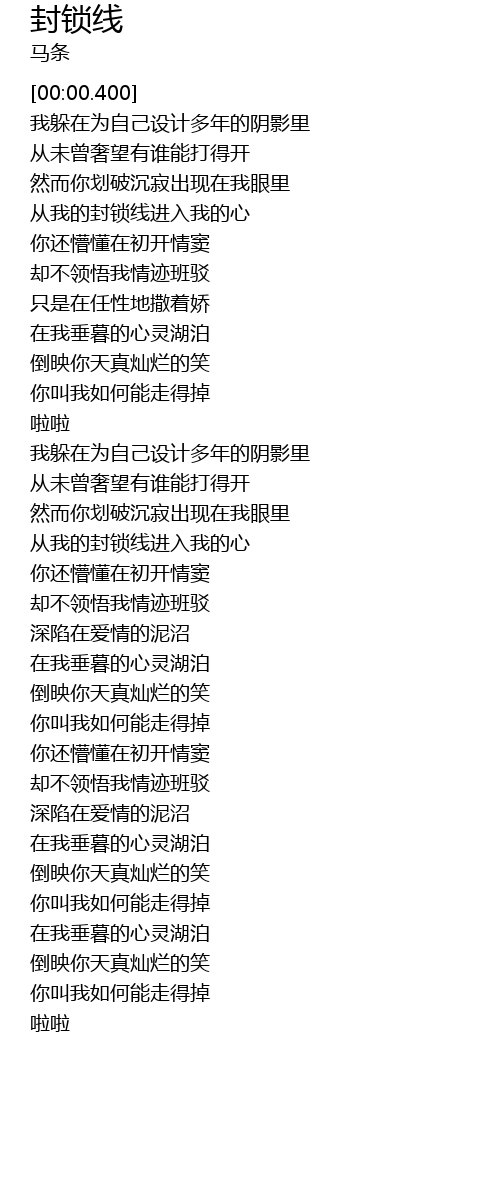 | [00:40.010] | 从我的封锁线进入我的心 |