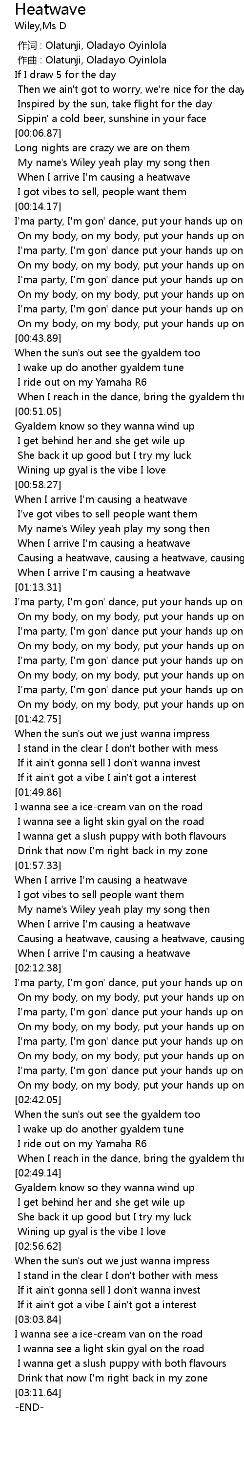 | [02:03.52] | When I arrive I' m causing a heatwave |