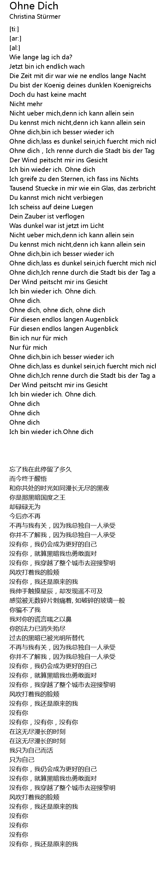 | [01:46.520] | Ohne dich,lass es dunkel sein,ich fuercht mich nicht |