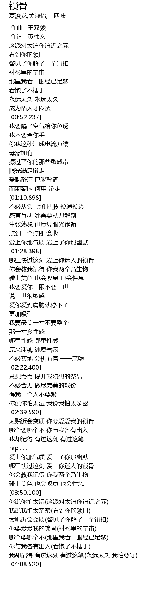 | [02:43.260] | 太贴近会变质 你要爱爱我的锁骨 |
