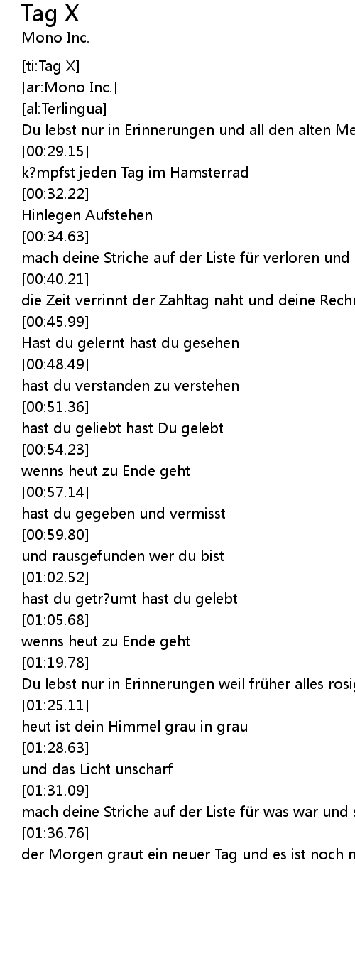 | [01:31.30] | mach deine Striche auf der Liste für was war und sollt nicht sein |