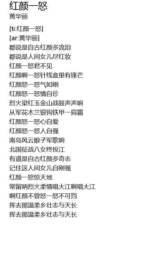 | [01:29.394] | hóng yán nù yī nù qì rú gāng |
