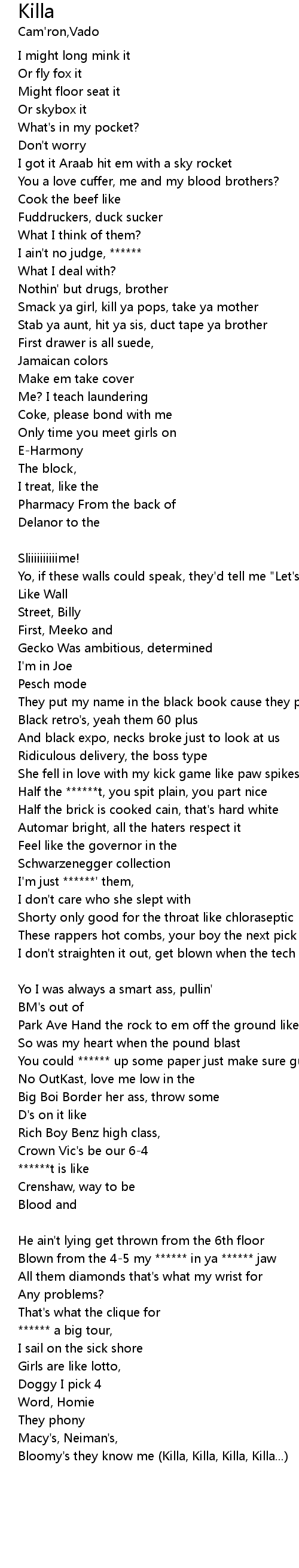 | I don't straighten it out, get blown when the tech spit (Killa, Killa, Killa, Killa...) [Verse 3: Vado] | |