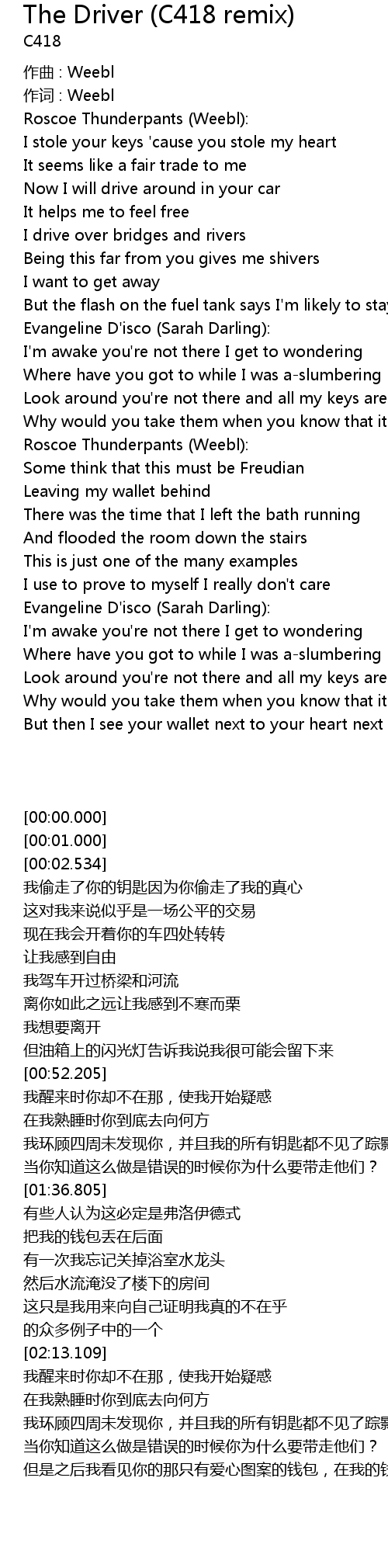 | [00:44.454] | But the flash on the fuel tank says I' m likely to stay |