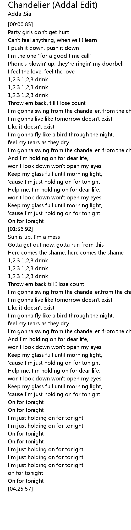 | [00:53.38] | I'm gonna swing from the chandelier, from the chandelier |