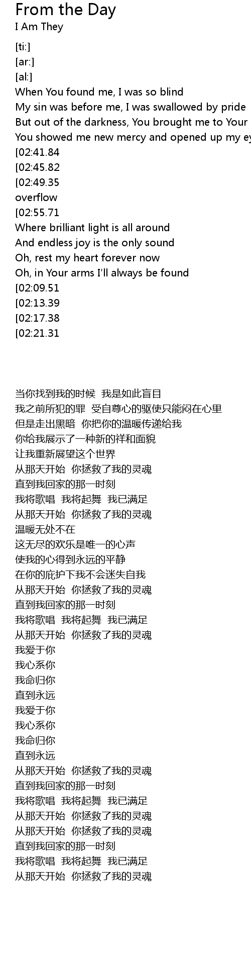 | [02:57.89][02:41.84][01:45.39][00:48.58] | From the day You saved my soul |