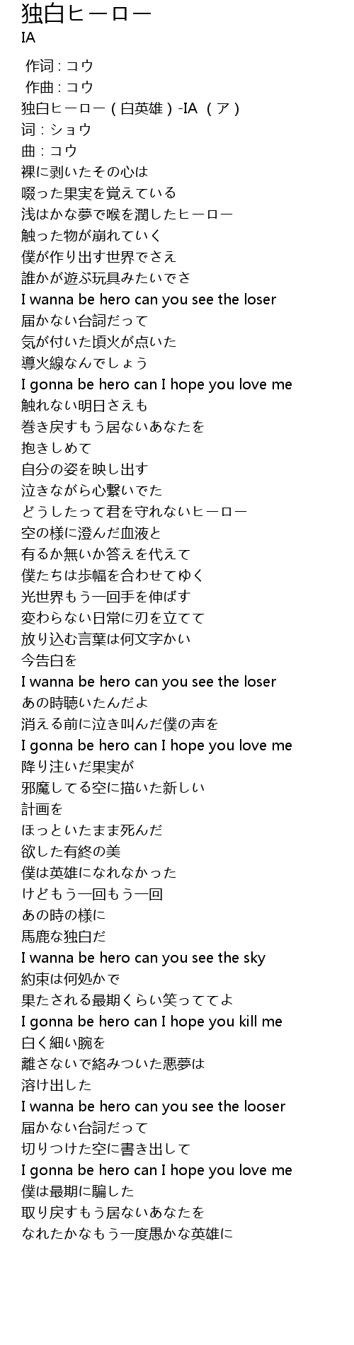 | [00:00.00] | 独白ヒーロー(白英雄)-IA (ア) |