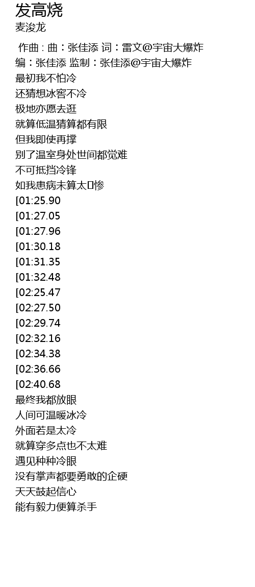 | [02:17.56][01:27.05][00:30.04] | 我发高烧 |