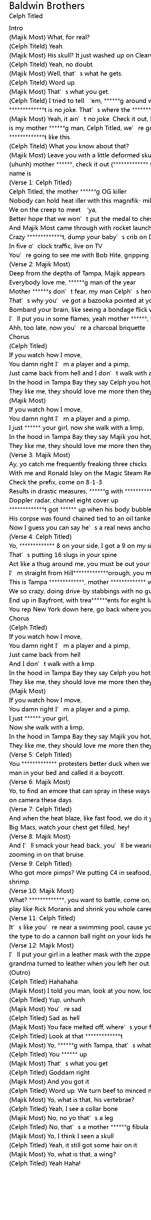 | (Celph Titeld) I tried to tell ‘em, ******g around with Tampa *************, *************t is no joke. That’s where the ************* I’m from man. | |