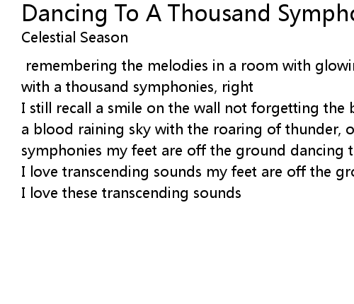 | I still recall a smile on the wall not forgetting the beating on the drums under a blood raining sky with the roaring of thunder, okay dancing to a thousand symphonies my feet are off the ground dancing to a thousand symphonies | |