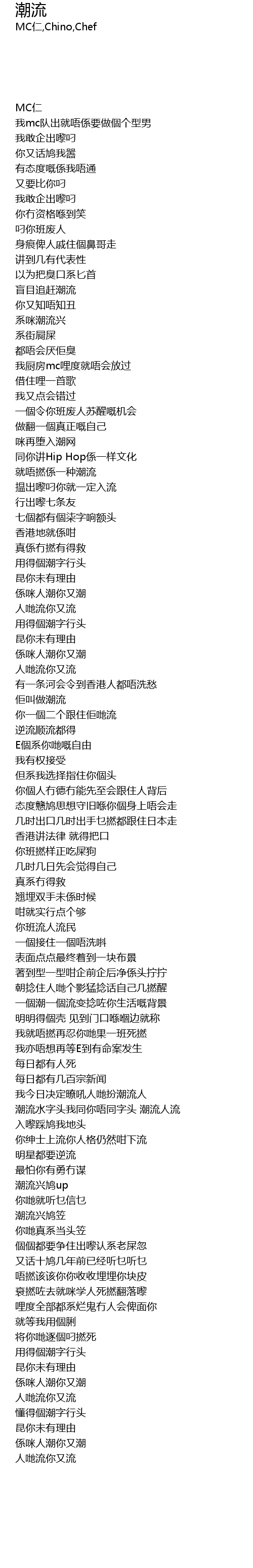 | [02:37.20] | 潮流水字头我同你唔同字头 潮流人流 入嚟踩鸠我地头 |