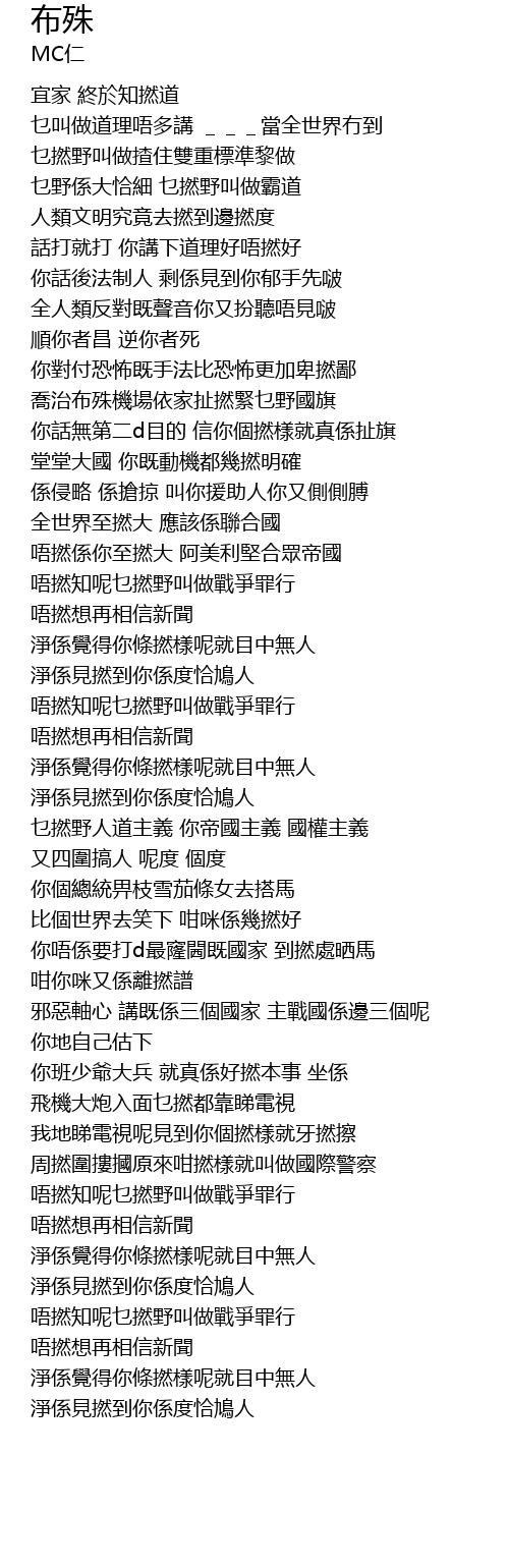 | [01:41.14] | 你唔係要打d最窿閪既國家 到撚處晒馬 咁你咪又係離撚譜 |