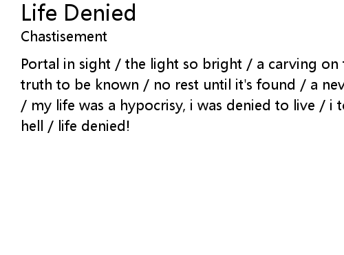| Portal in sight / the light so bright / a carving on the sign / life denied / truth to be known / no rest until it's found / a neverending sound / life denied / my life was a hypocrisy, i was denied to live / i took my life with me down to hell / life denied! |