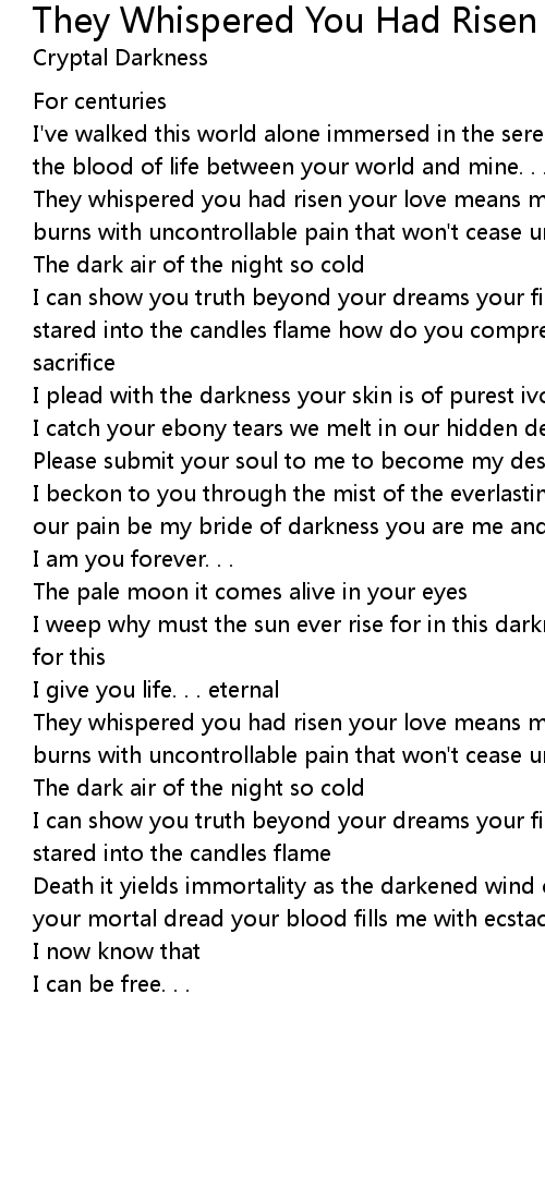 They whispered you had risen your love means more than life itself your neck burns with uncontrollable pain that won't cease until you rest in the shadows |