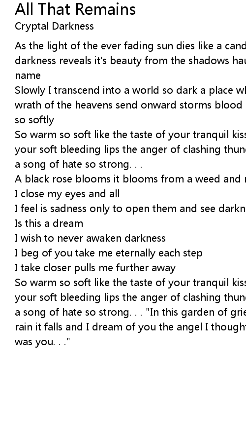So warm so soft like the taste of your tranquil kiss your tranquil kiss from your soft bleeding lips the anger of clashing thunder sings a song of hate sings a song of hate so strong. . . "In this garden of grief I stand alone scarlet rain it falls and I dream of you the angel I thought I knew the angel I thought was you. . ." |