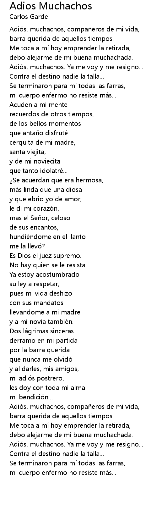 | Adiós, muchachos. Ya me voy y me resigno... | |