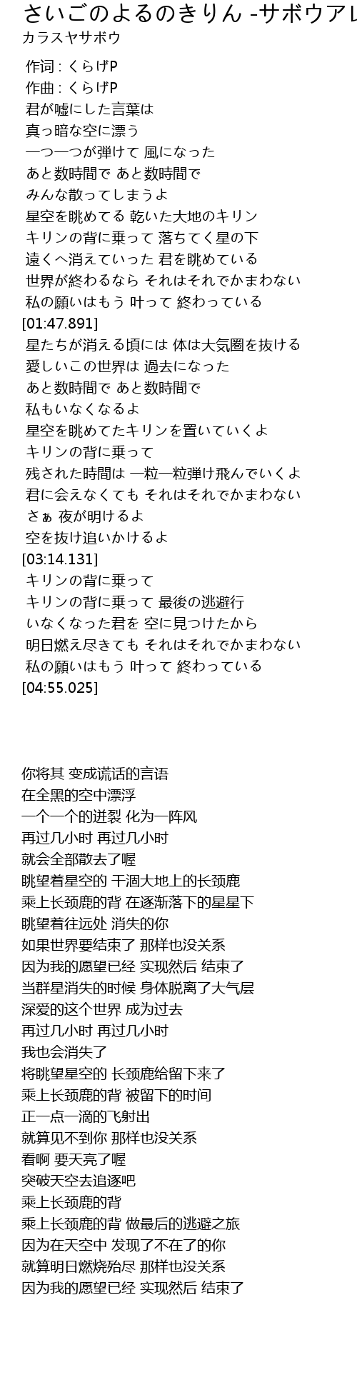 | [02:25.213] | 星空を眺めてたキリンを置いていくよ |