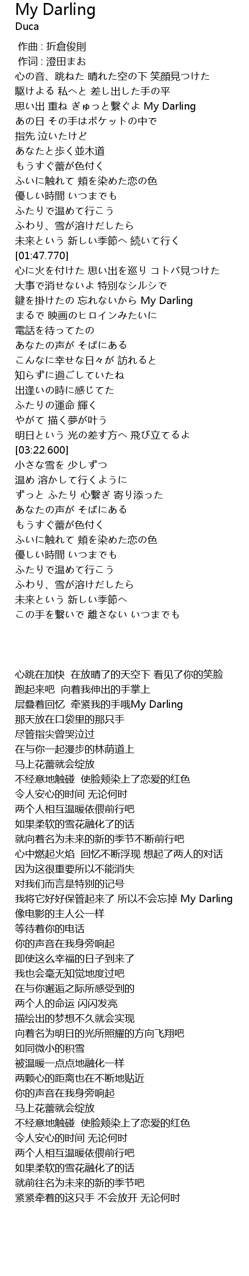 | [00:45.320] | 思い出 重ね ぎゅっと繋ぐよ My Darling |