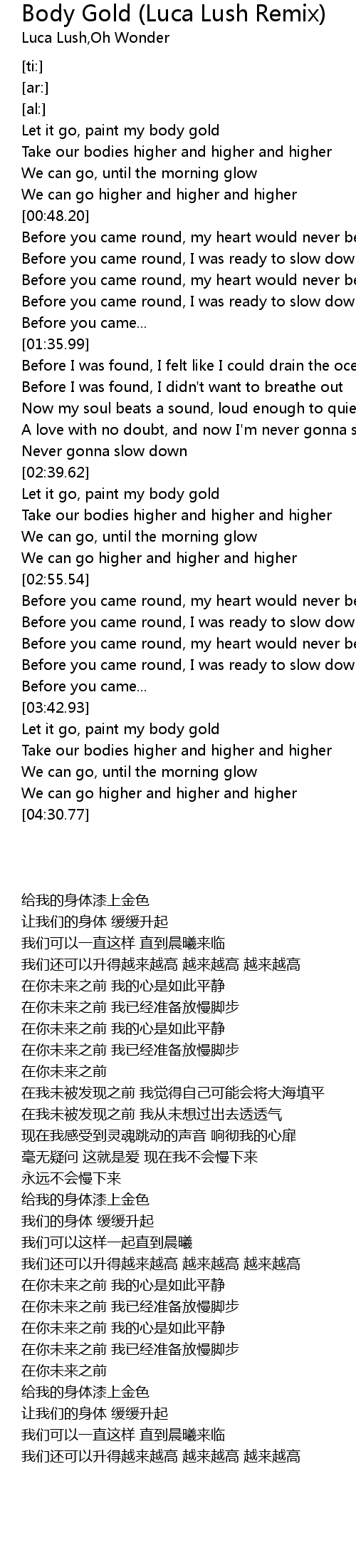 | [04:14.92] | Let it go, paint my body gold |