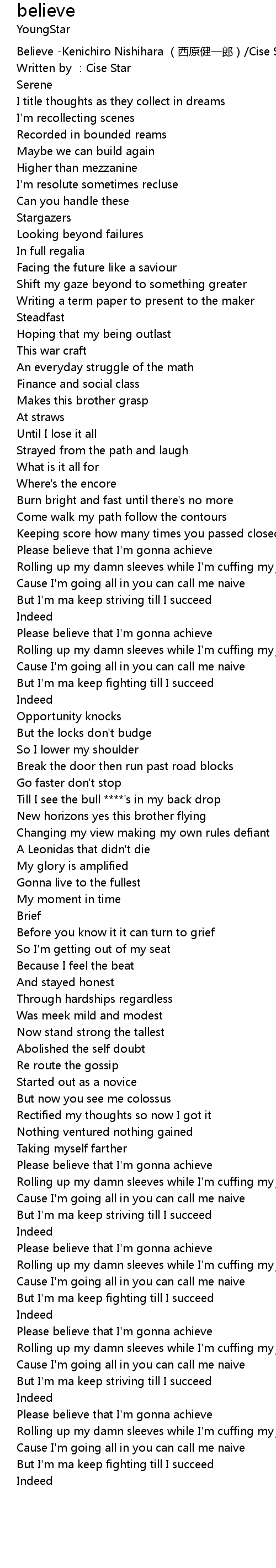| [03:10.410] | Please believe that I'm gonna achieve |