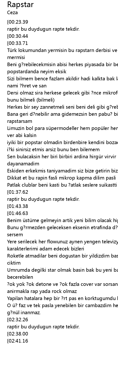 | [02:19.74] | ? ok yok ? ok detone ve ? ok fazla cover var sorsan isi bilen onlar anirmakla rap yada rock olmaz |