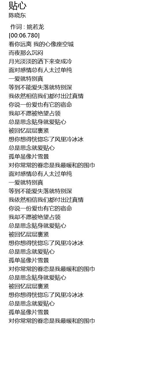 | [01:06.880] | 总是思念贴身就爱贴心 |