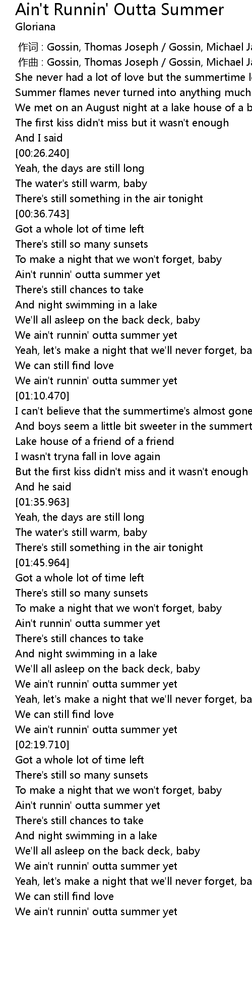 | [02:59.964] | We ain't runnin' outta summer yet |