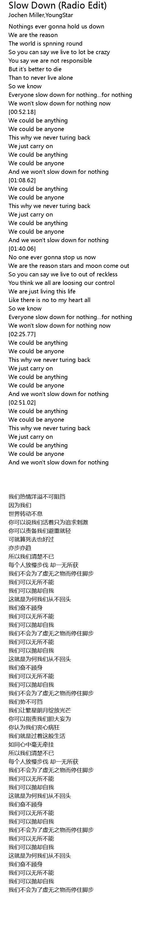 | [00:37.13] | Everyone slow down for nothing for nothing |