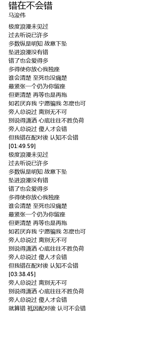 | [01:40.91] | dàn wǒ cuò zài pèi duì hòu rèn zhī bú huì cuò |