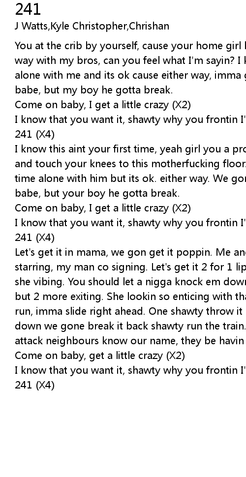 I know that you want it, shawty why you frontin I'm tryna get the 241 (X2) |