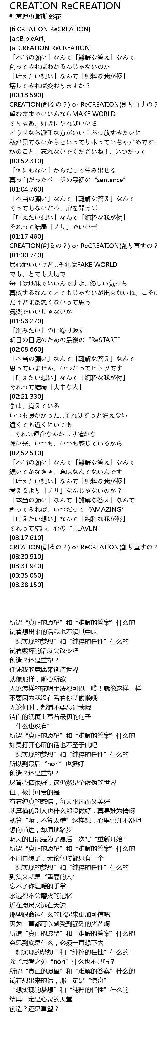| [03:18.430] | CREATION(創るの?) or ReCREATION(創り直すの?) |