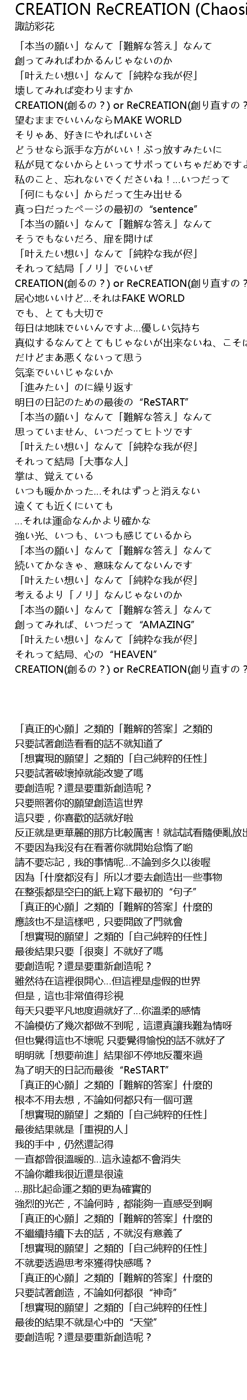| [03:18.430] | CREATION(創るの?) or ReCREATION(創り直すの?) |