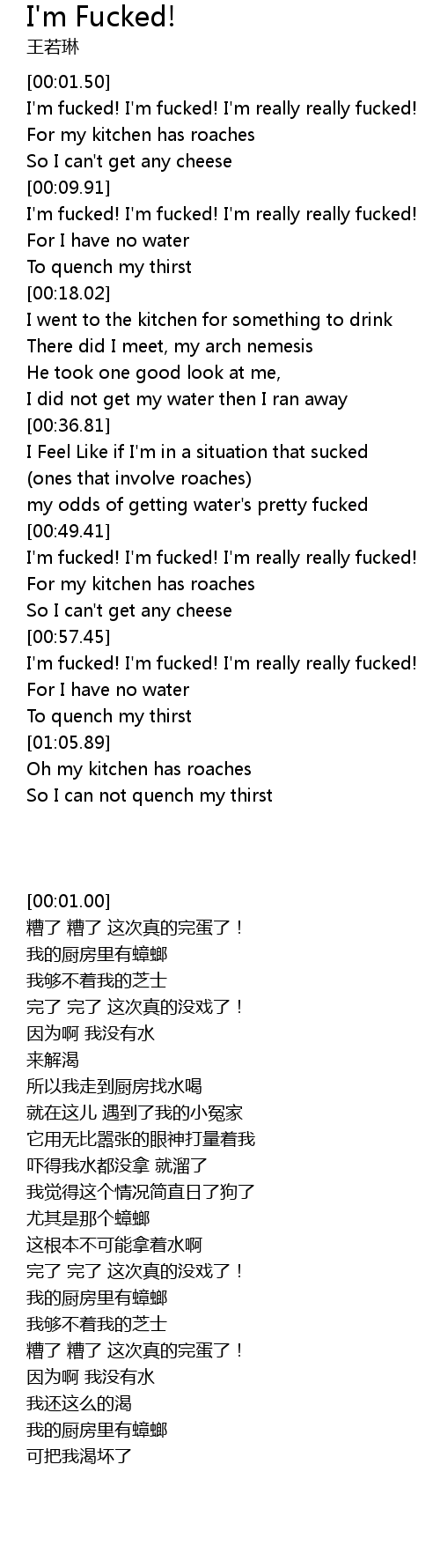 | [00:58.19] | I'm fucked! I'm fucked! I'm really really fucked! |