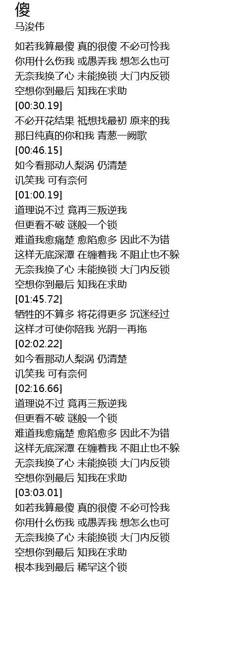 | [00:00.64] | 如若我算最傻 真的很傻 不必可怜我 |