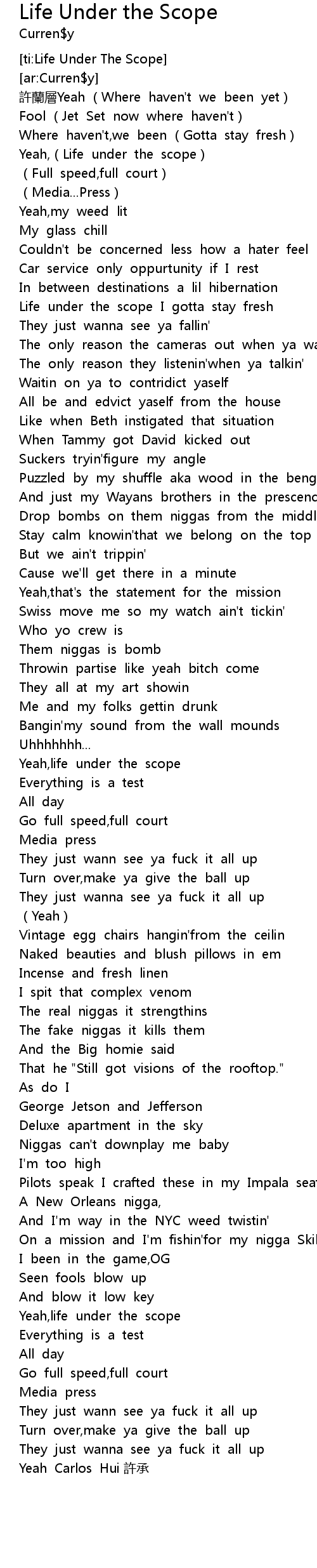 | [00:31.38] | Life under the scope I gotta stay fresh |