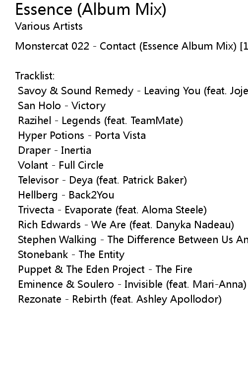 | [00:00.00]Monstercat 022 - Contact (Essence Album Mix) [1 Hour of Electronic Music] |