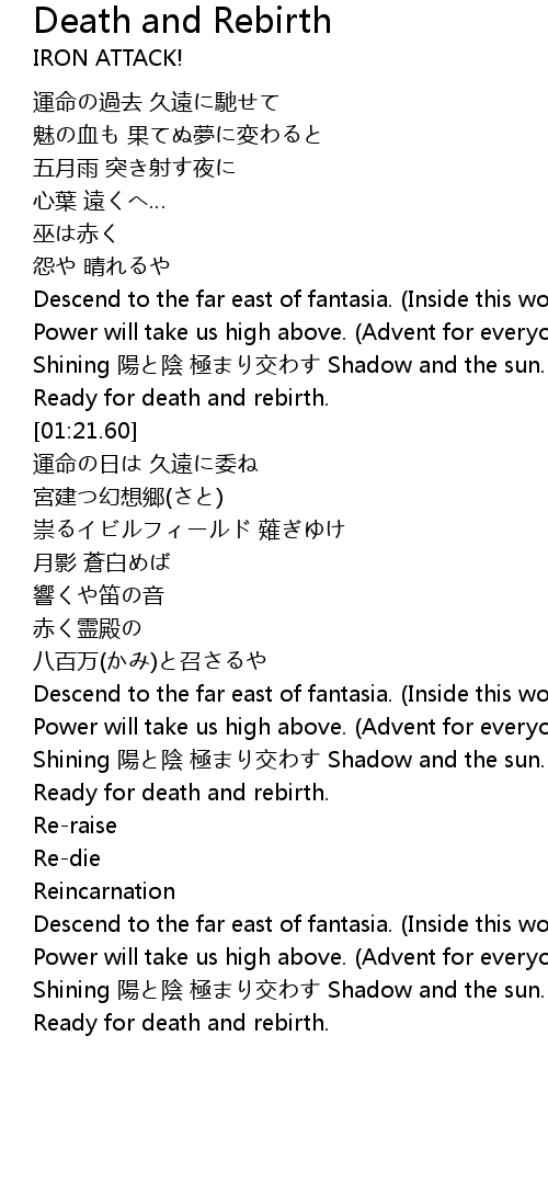 | [02:14.34] | Shining 陽と陰 極まり交わす Shadow and the sun. |