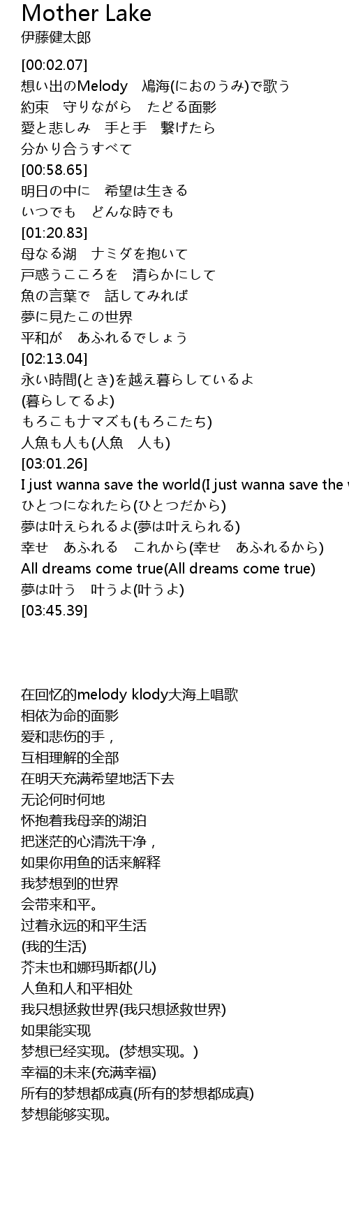 | [01:22.33] | 母なる湖 ナミダを抱いて |